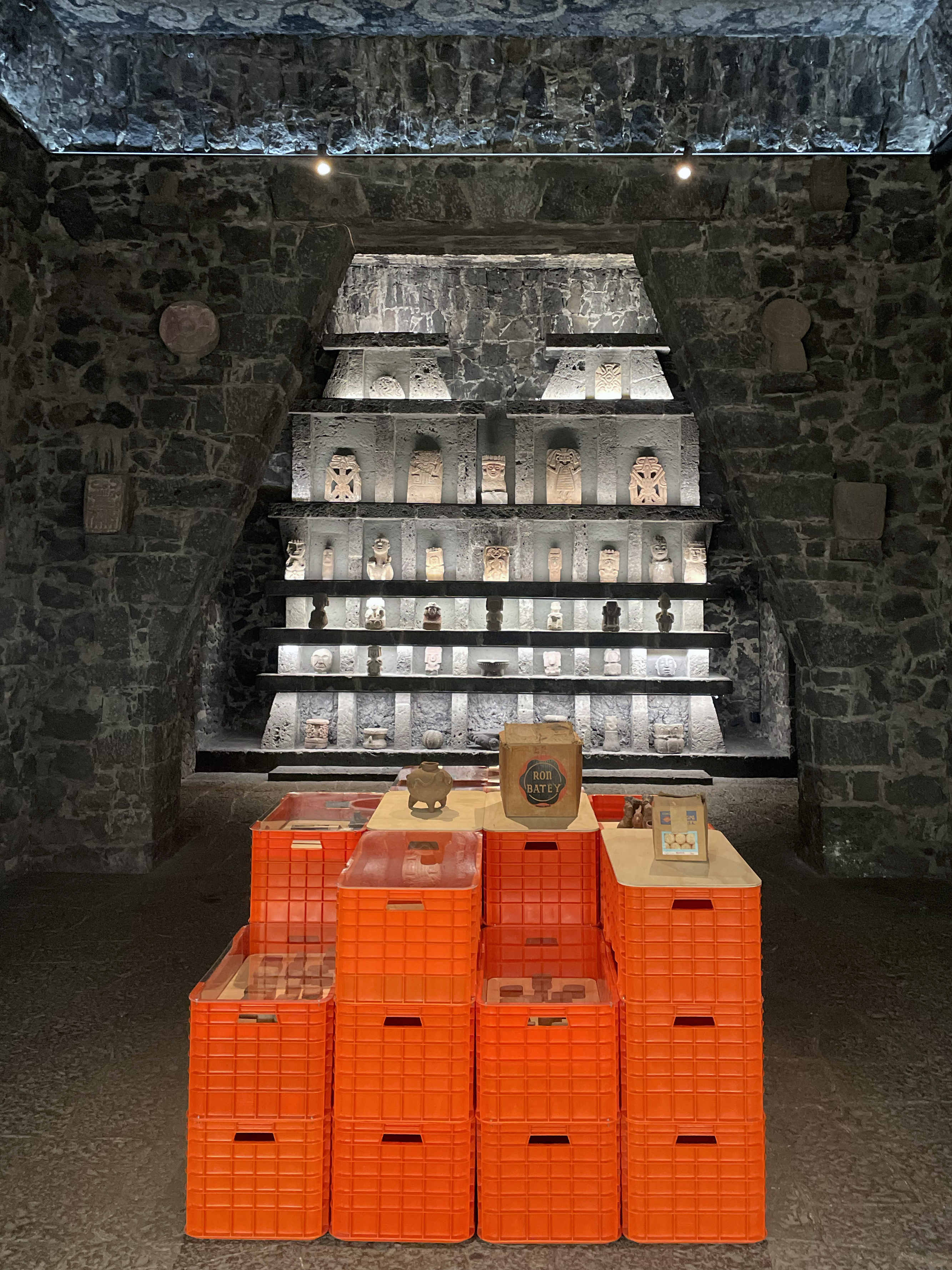 Upon entering Anahuacalli, the doorkeeper heralds the brittle material of place that has been introduced to the building’s otherwise flinty frame, by advising visitors to exercise caution around works in papier mâché. Yet across the cavern’s ground floor chambers, it is plastic crates which stack up, on and in which are displayed a sundry of things. Anthropomorphic vessels and the cardboard boxes in which they were first transported into the museum rest alongside a book from which López Medel’s fascination with paper draws. This last is a robust reference for paper fabrication traditions of the Aztec and Mayan, groups after whose architectural conceptions the museum was built under Diego Rivera’s vision. At this outset, the orange boxes’s industrial mien rises among the prehispanic clay objects that surround them, interveniently suspending art and artefact’s relentless antagonism. Where in one display shelf, López Medel humorously and seriously places vegetable and fruit inside a papier mâché bowl and casts fictitious the guises of a collection’s permanence. By replacing a centuries-old item with such, he converses with Rivera’s nationalist and modernist aspirations for the foundation of a temple housing excavated objects, at the same time that he makes an entrance into the museum’s crevices to ask how a work of art may appear inconspicuously in front of us or to betray the way by which a collection amasses and possesses shape. At this moment, he constitutes what else may be contained in, cradled by, or held in the indistinguishable corpora of collection, museum, and edifice.