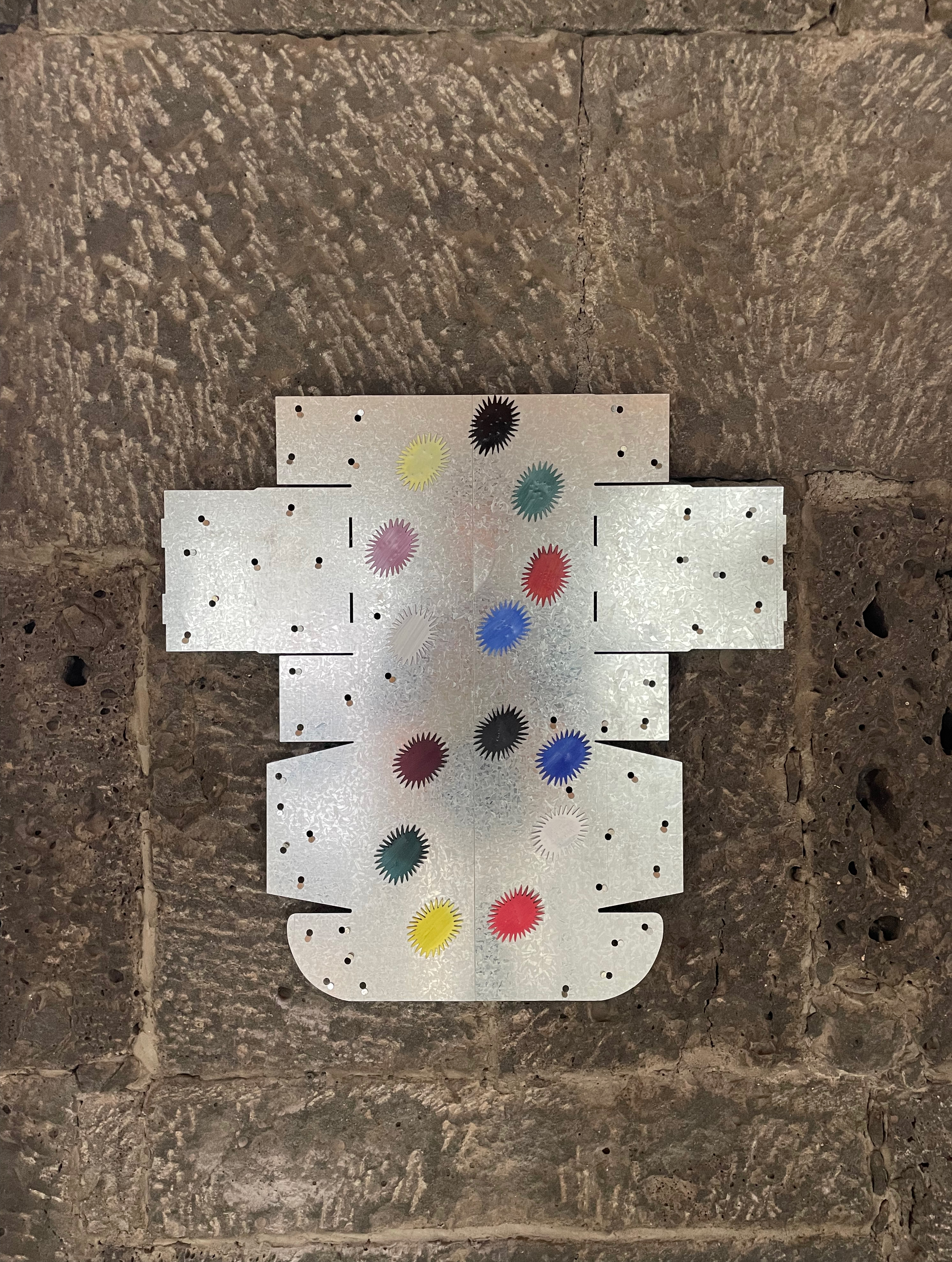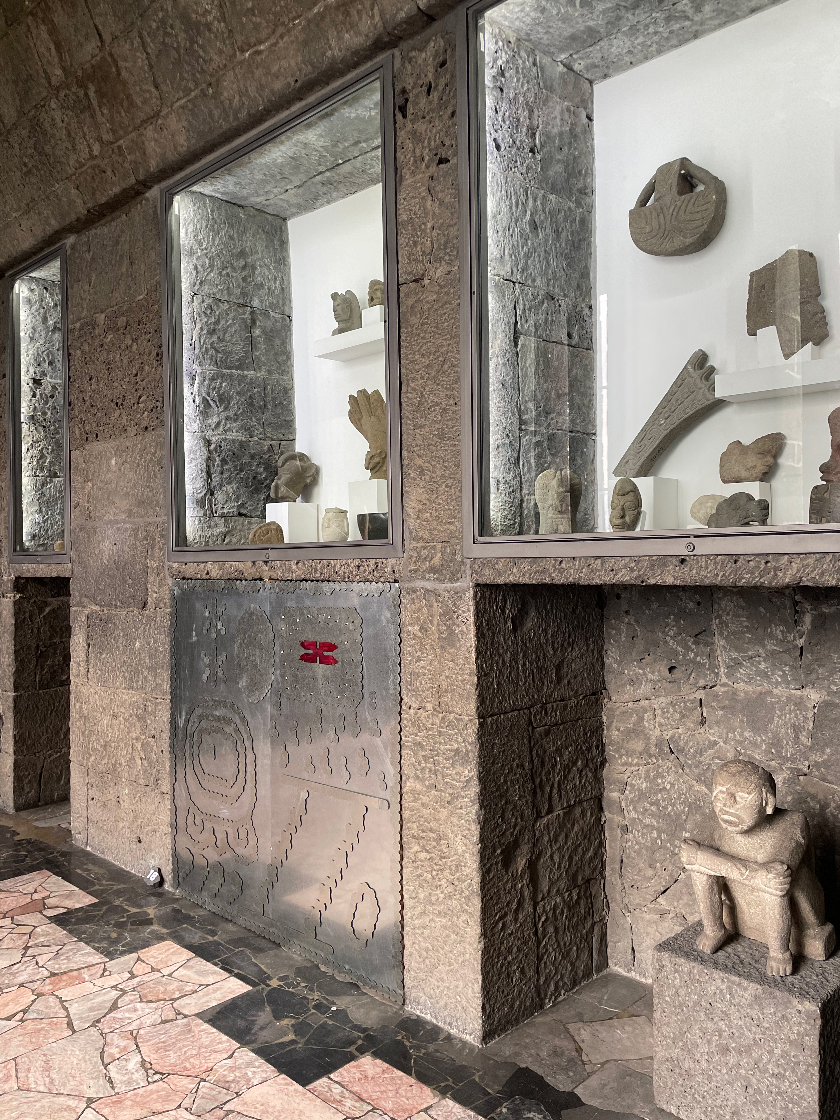 Finally and again, the trace of placement appears in metal on the topmost level where the gesture is that of covering. Take for example Sol rojo and another embossed sheet, which sharing a room, lay over niche and ceiling, and in that, veil mural and sculpture with the slight and strong evocation of the color red, among pieces cut and galvanized to conjure the flatness of pre-contact paper dolls. Together, Ulrik López and curator Karla Niño de Rivera test to sense what may count as an exhibition piece, especially in the company of objects formidably cased in glass display and with whose metal frames they espouse a kind of relationship. Altogether, what may be suspended from a roof, hung on a wall, leaned against partitions, and laid on the ground are trialed by works which for the time being adhere to Anahuacalli’s organs. In other words, they hold place to the degree that their material, color, scale, and very position turn into their venue, that is, their own coming and becoming. Besides an exhibition site or a collection’s home, López Medel posits what else can be placed inside a museum, or more sensibly, of what else a museum can be a place of.