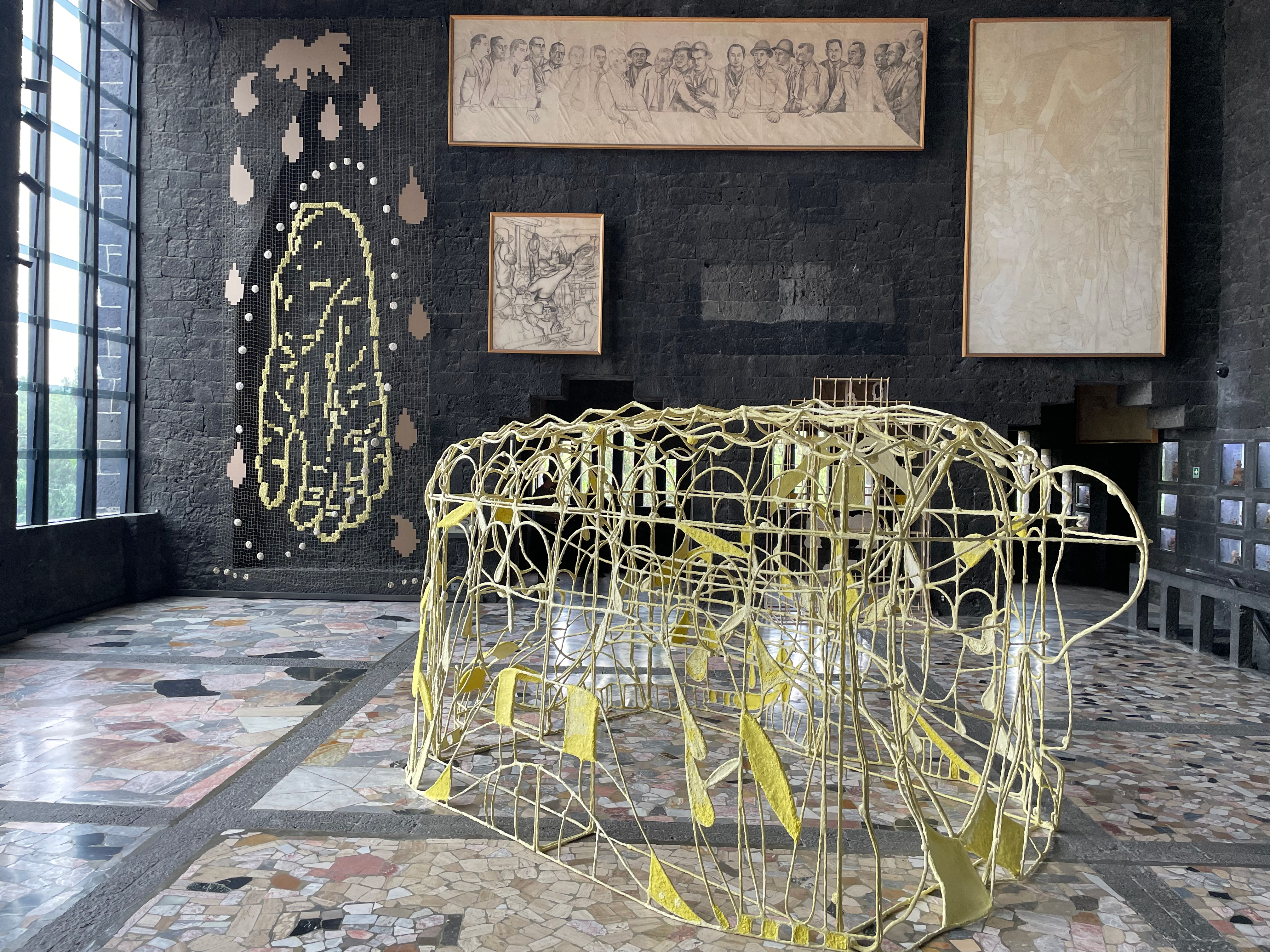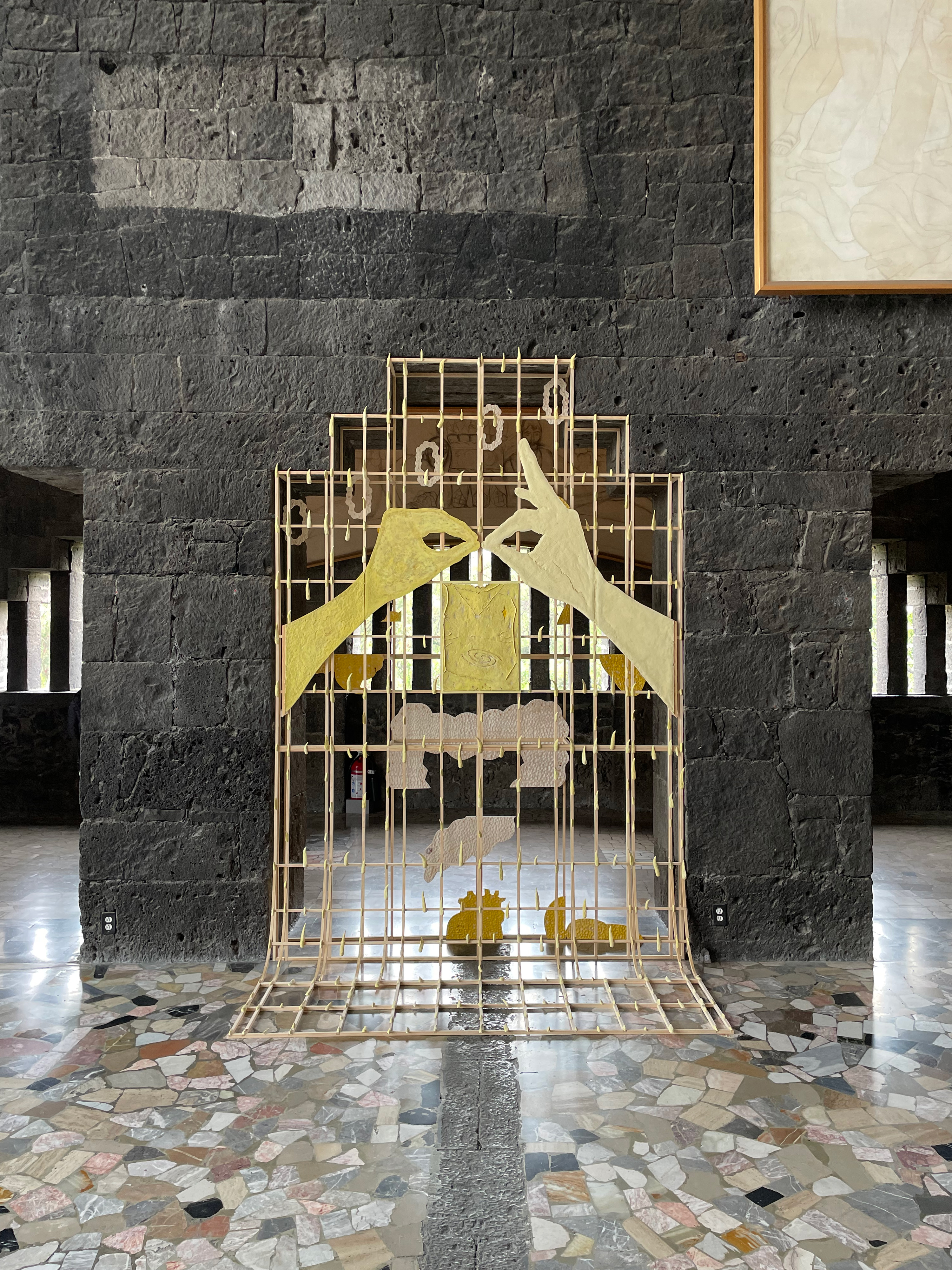 Only on the following floor will yellow papier mâché appear, merrily inhabiting the solemn hall darkened by the museum’s volcanic rock. Namely, Espejo amarillo and Pie en el jardín’s work is that of insertion, where infixing wood into the museum’s gateways and wall cavities, they fill the architectural perdurability of Anahuacalli’s grid with doubt as they so insist to be, if only slightly or momentarily, be incorporated into the museum’s body. Placeholding is their language, just the same as that of Jardín anonimo which inundates a corner chamber with plant species sitting on plastic stools in papier mâché, lushly overwhelming hence the room’s austerity and stillness with green devices of rest, gathering, and growth.